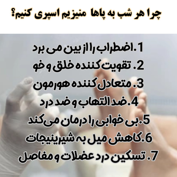 ❇️اسپری منیزیم مهرکده سلامتی به رفع کمبود منیزیم و بهبود درد عضلات، اسپاسم و گرفتگی پاها کمک میکند.